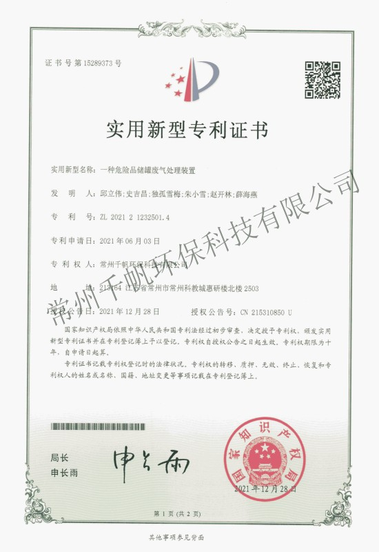 實用新型專利證書  一種危險品儲罐廢氣處理裝置