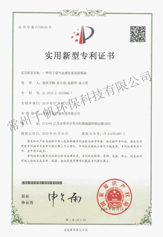 實用新型專利證書  一種用于廢氣處理的高效除霧器